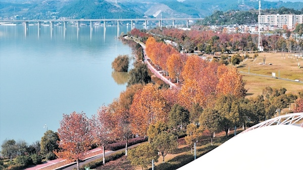 初冬时节,云阳区龙舟广场旁,黄叶如金,红叶如云飘浮在沿江绿化带上,为汉江大堤增添了色彩斑斓的“花边”,绘就了一幅美丽的画卷,淋漓尽致地展现了独特的生态美。沿着河边散步,游客可以坐下来欣赏风景,也可以悠闲地漫步,欣赏湖光山色。供图:特约记者 王涛